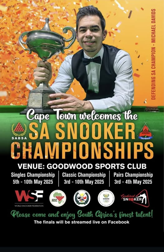 South African Snooker Championships 2025Goodwood Sports Club3rd – 10th May 2025 Moments from the past… SA Snooker Championships 20253 blockbuster events under 1 roof 5th – 10th MaySingles ChampionshipSingle Men’s Championship featuring 12 groups with more than 60 of South Africa’s Best 3rd – 10th MayClassic ChampionshipSingle Men’s Classics featuring 50+ of the classic legends of South African Snooker 3rd – 4th MayPairs ChampionshipSingle Men’s Pairs Championship featuring 13 Pairs of the best teamed up together.